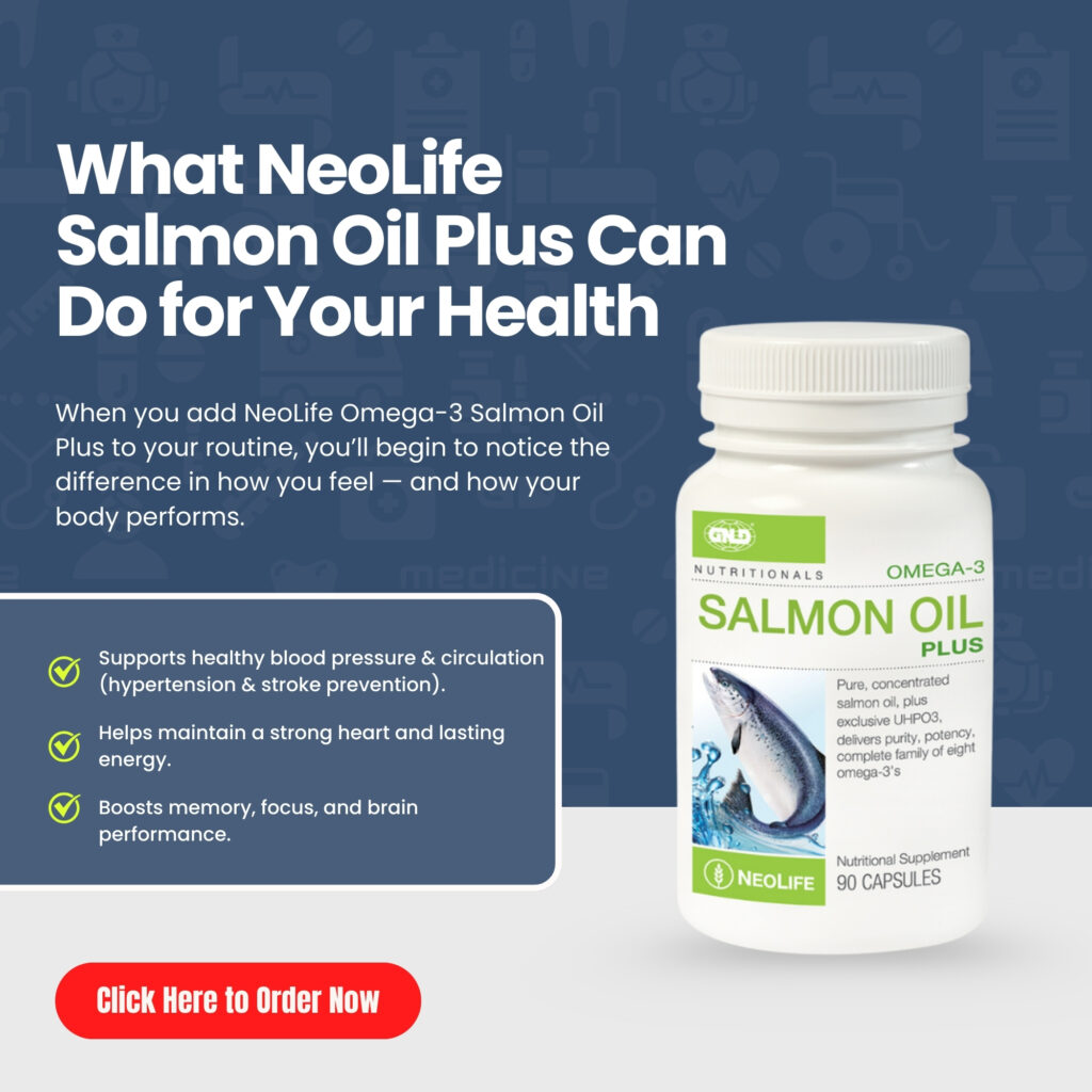 That’s why NeoLife created Omega-3 Salmon Oil Plus — a pure, balanced supplement trusted worldwide to support healthy blood pressure, heart function, and total wellbeing.